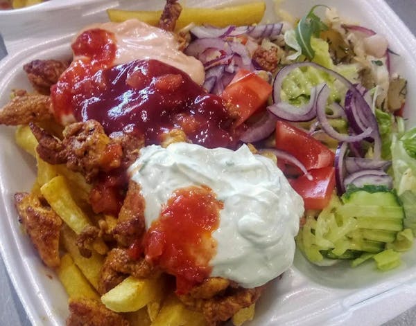 Roszponka , rukola , sałata lodowa, burak kiszony , ogórek kiszony , marchewka , cebula czerwona , sos tzatziki , shorma